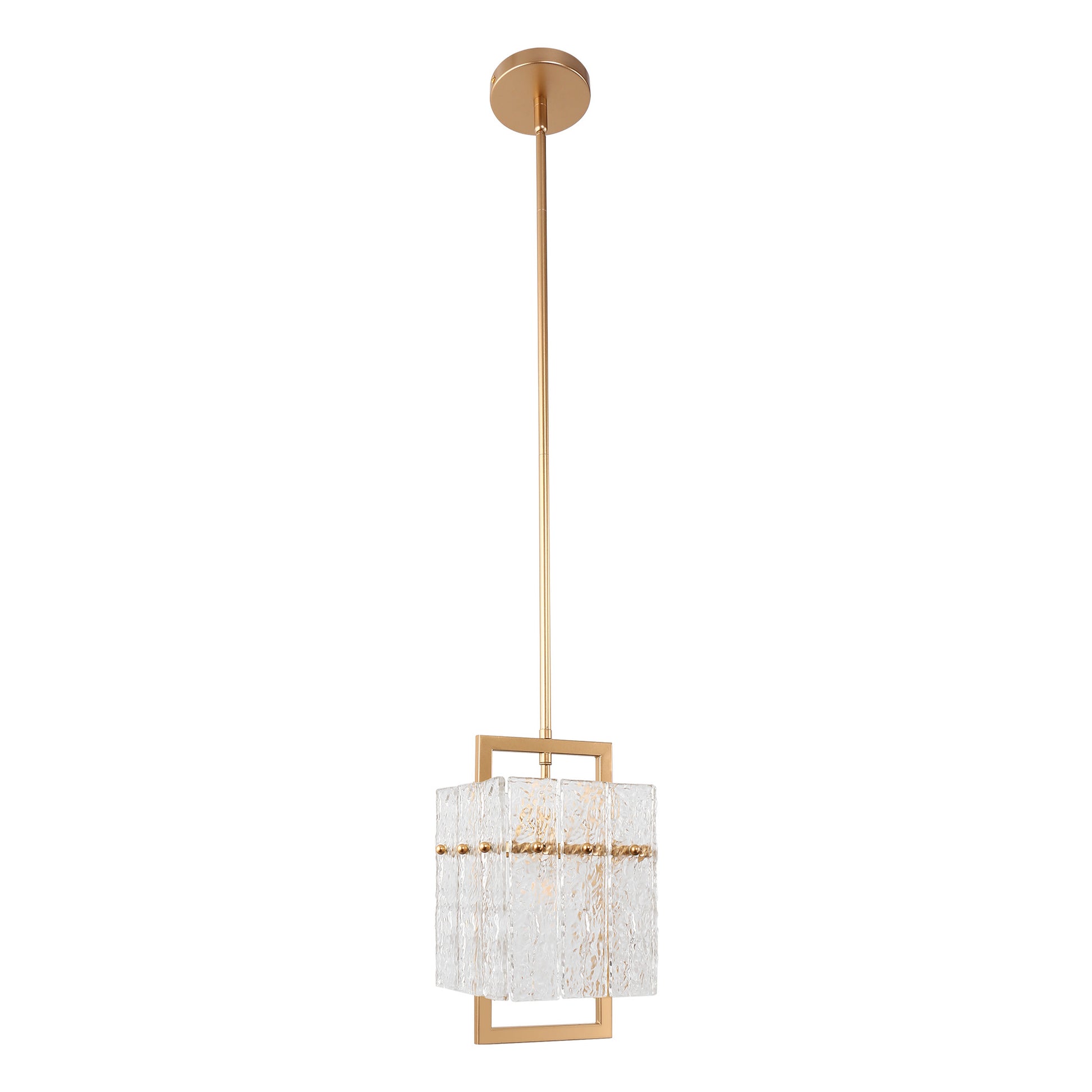 This 1-light pendant features a sleek gold finish with an elegant glass decoration and a suspended downrod. Its simple yet refined silhouette complements a variety of interiors. Designed with an E12 socket and no bulb included, it offers flexible customization.