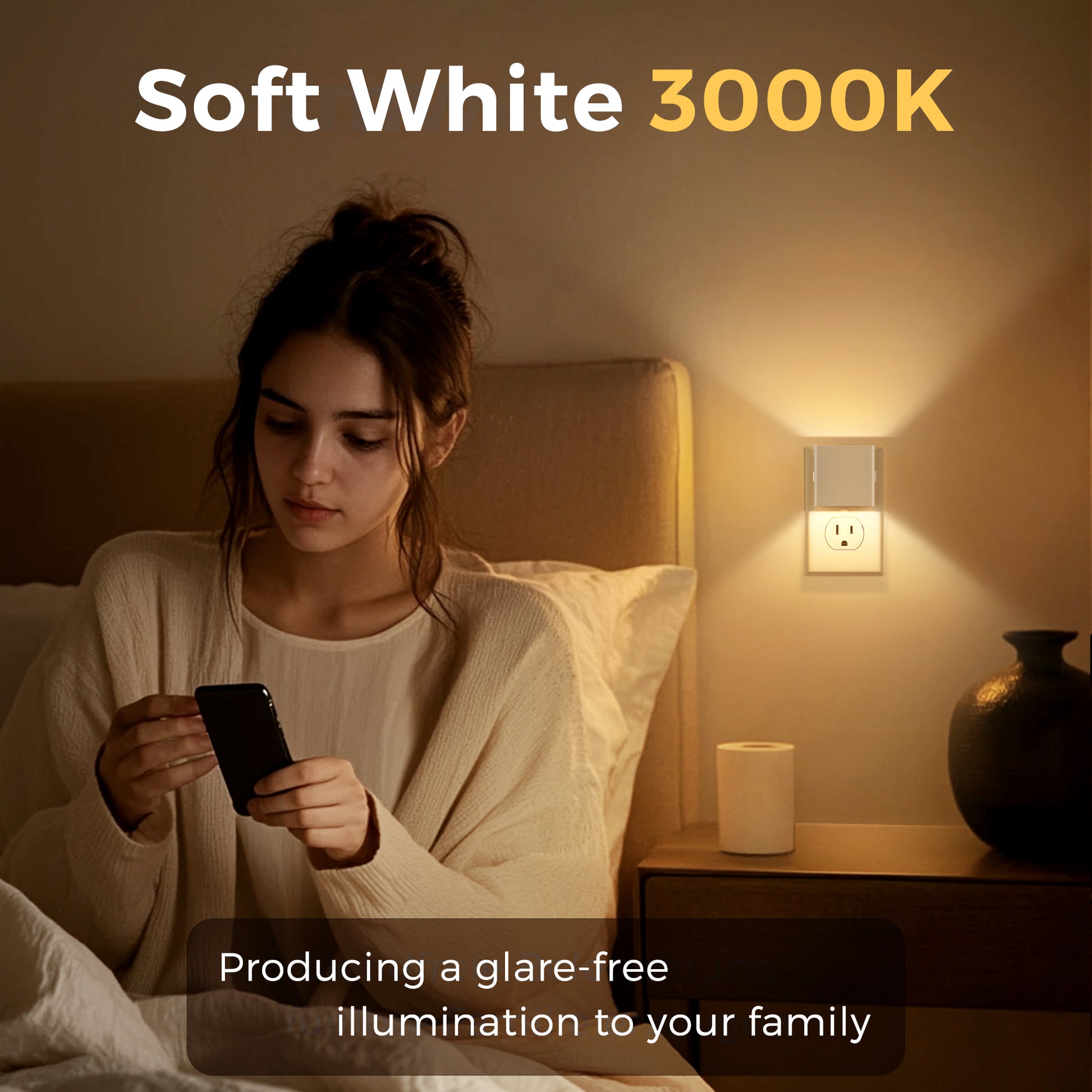 This 1W Integrated LED plug-in night light features a white square wall-like design with up-down illumination, emitting warm 3000K light. The night light supports three brightness levels adjustable via a button and retains the last selected brightness after power-off. Long press for 2 seconds to turn off, then press to restart, while the Light Sensor activates automatically in low-light conditions for hands-free operation.