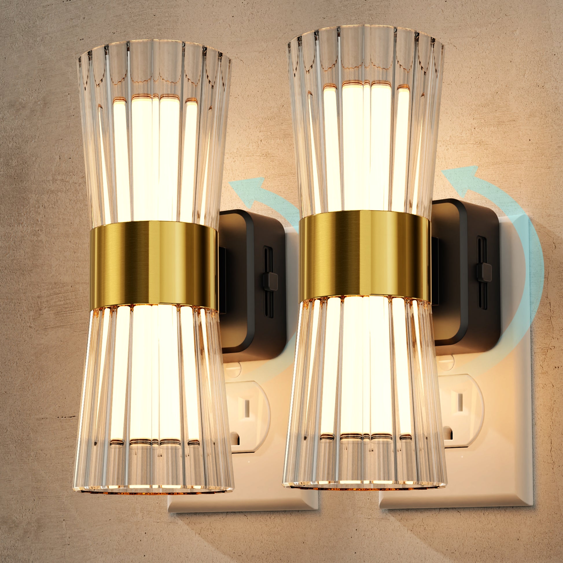 This 2-pack 1W plug-in night light features a transparent dual long cover combining PC and frosted inner layers, creating a sophisticated wall light effect. The sliding dimmer allows smooth adjustment from 0% to 100%, providing the perfect brightness for any environment. Its black backplate with copper-plated metal accents and rotatable US three-prong plug ensures easy installation, durability, and flexible positioning.
