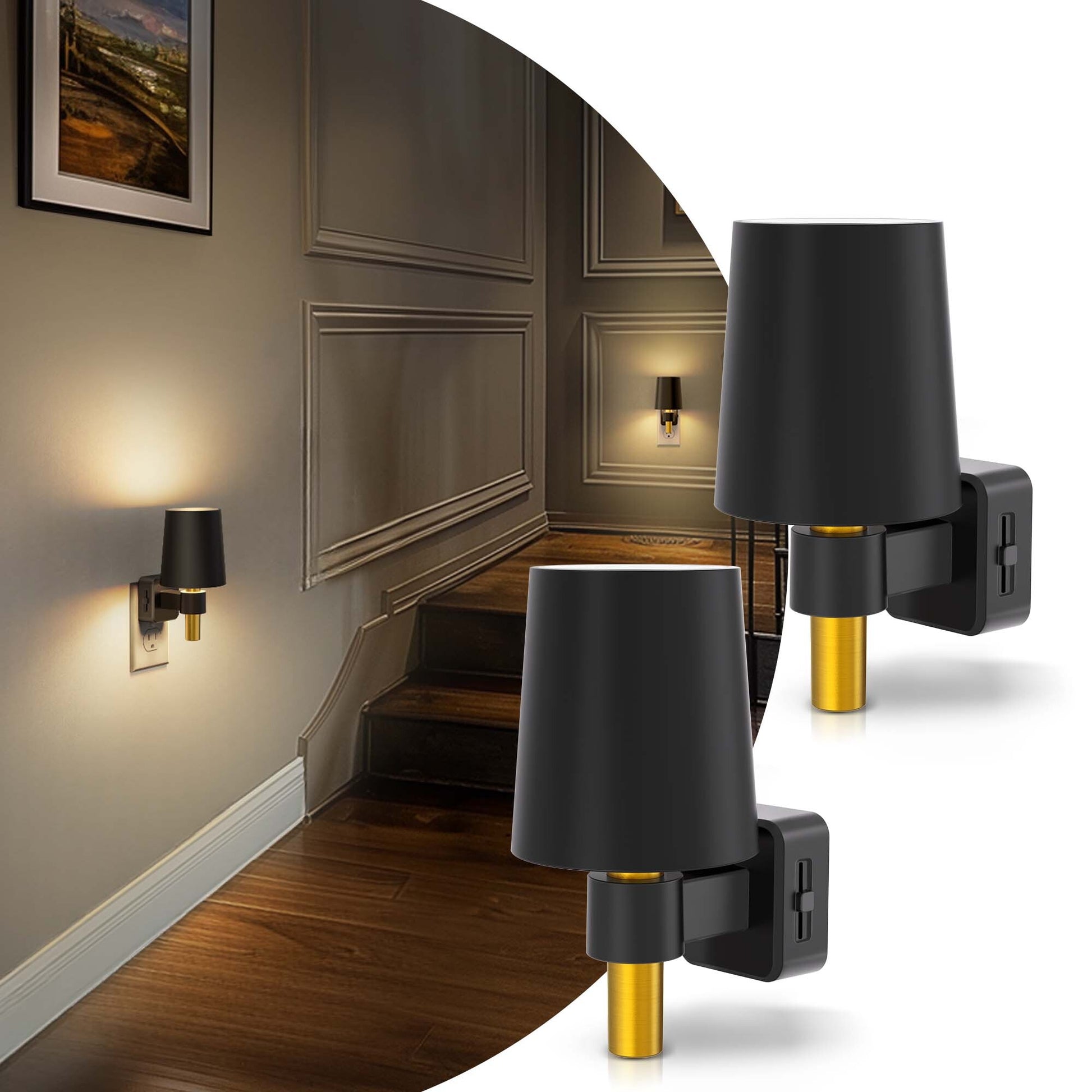 This 2-pack 1W plug-in night light features a painted round shade with integrated LED lighting, providing warm amber illumination from both top and bottom. The sliding dimmer allows full control from 0% to 100% brightness, making it easy to adjust lighting for any mood. Its black casing with plastic metallic accents and US three-prong plug ensures quick, safe, and stylish installation in bedrooms, hallways, or bathrooms.