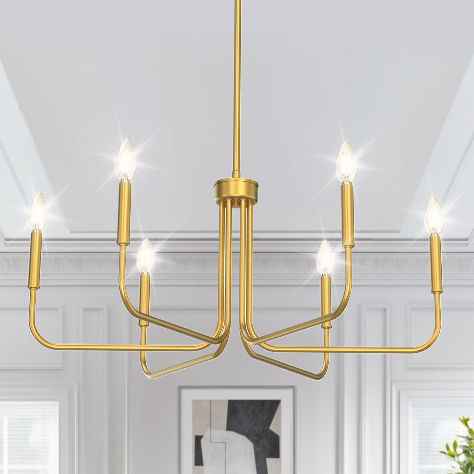 Bring timeless charm to your space with this farmhouse-inspired chandelier, blending rustic elegance with industrial design elements. Finished in Gold and featuring 6-candle-style lights, this fixture offers both functional lighting and stylish appeal. With adjustable height and compatibility with various bulbs, it provides versatility in creating the perfect ambiance for dining rooms, living areas, and kitchen islands. A perfect fusion of vintage warmth and modern style.