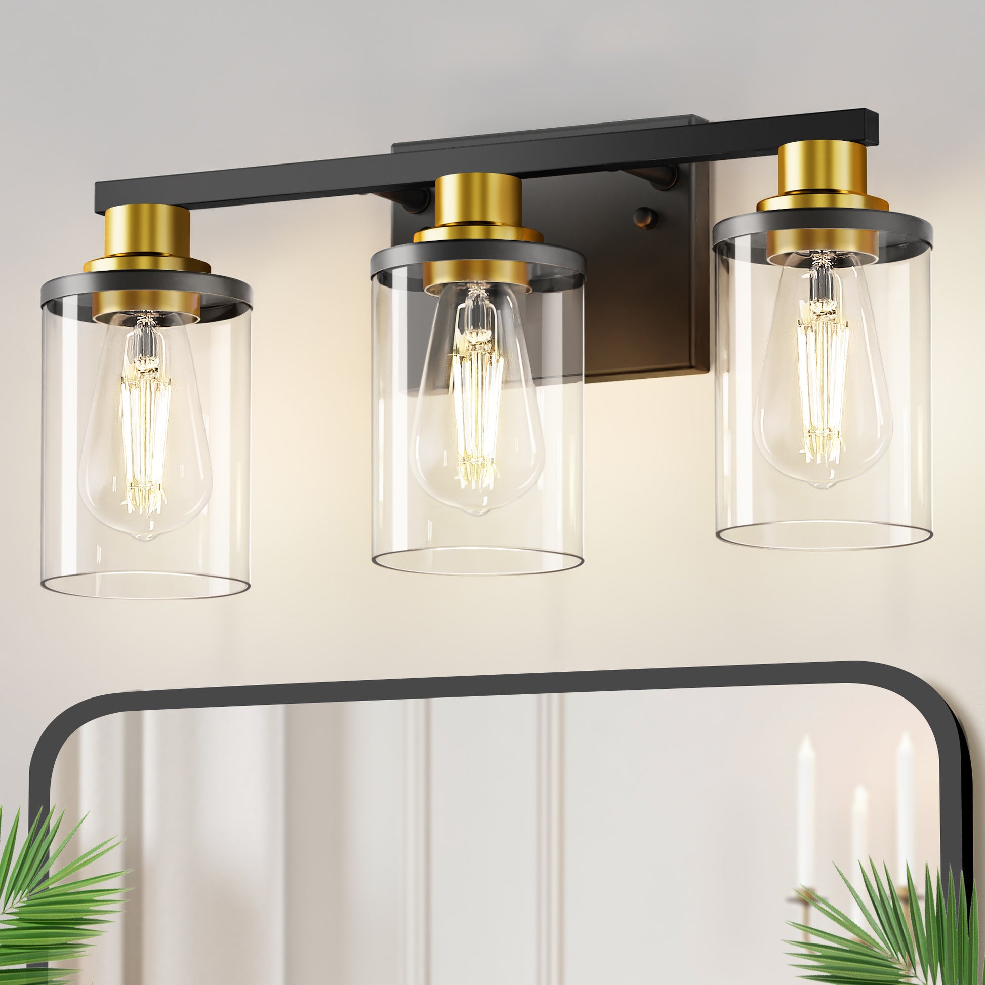 YANSUN 3 Light Black and Gold Vanity Light with Clear Tube Glass Shades and Square Backplate for Bathroom Mirror E26 Base