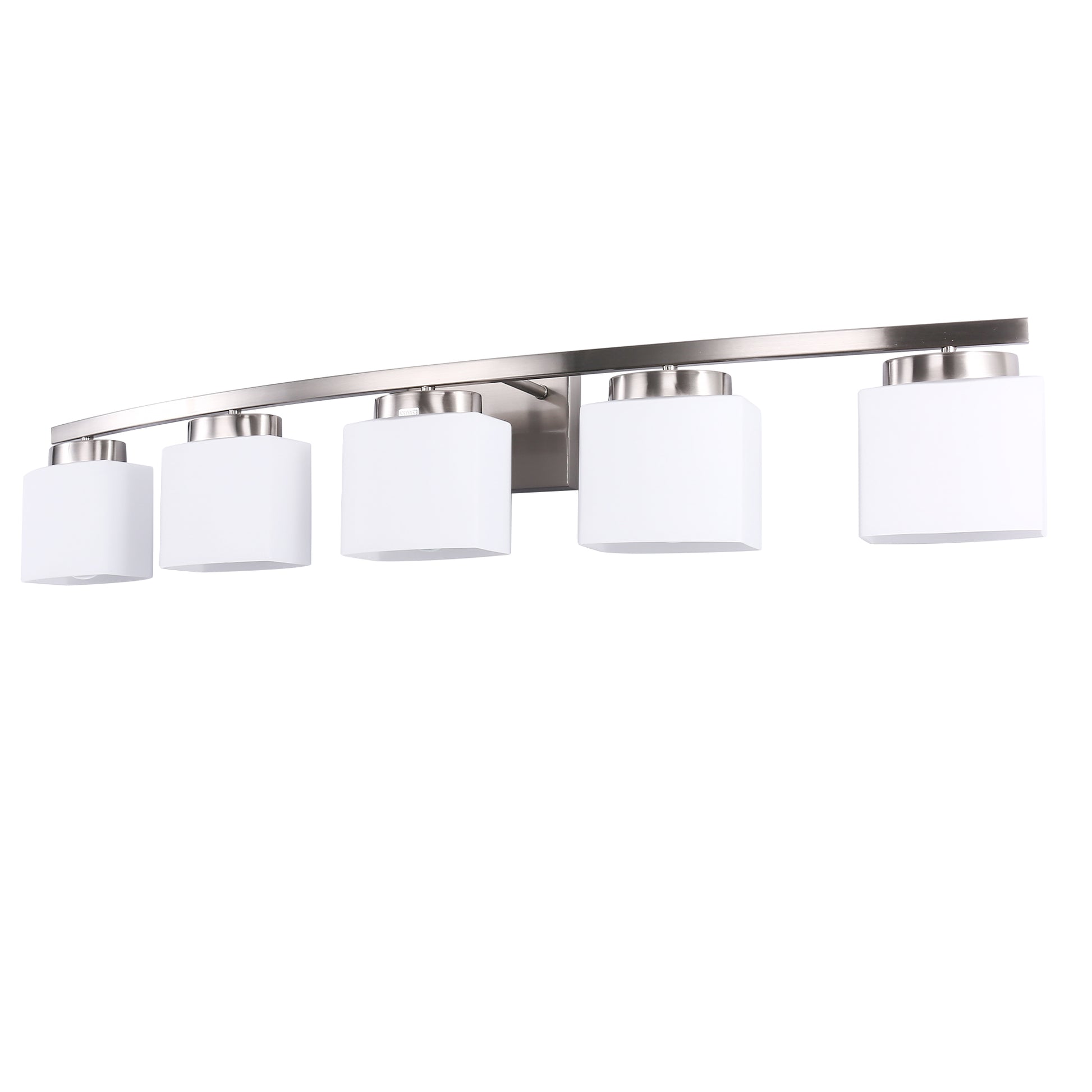 Bring bold industrial style to your home with this 5-light brushed nickel vanity fixture, featuring curved arms and square milk white glass shades. At 41 inches wide, this modern vanity light delivers soft, balanced illumination ideal for bathrooms, bedrooms, hallways, and more. Compatible with vintage-style T45 bulbs, this versatile fixture blends statement design with functional lighting for everyday spaces.