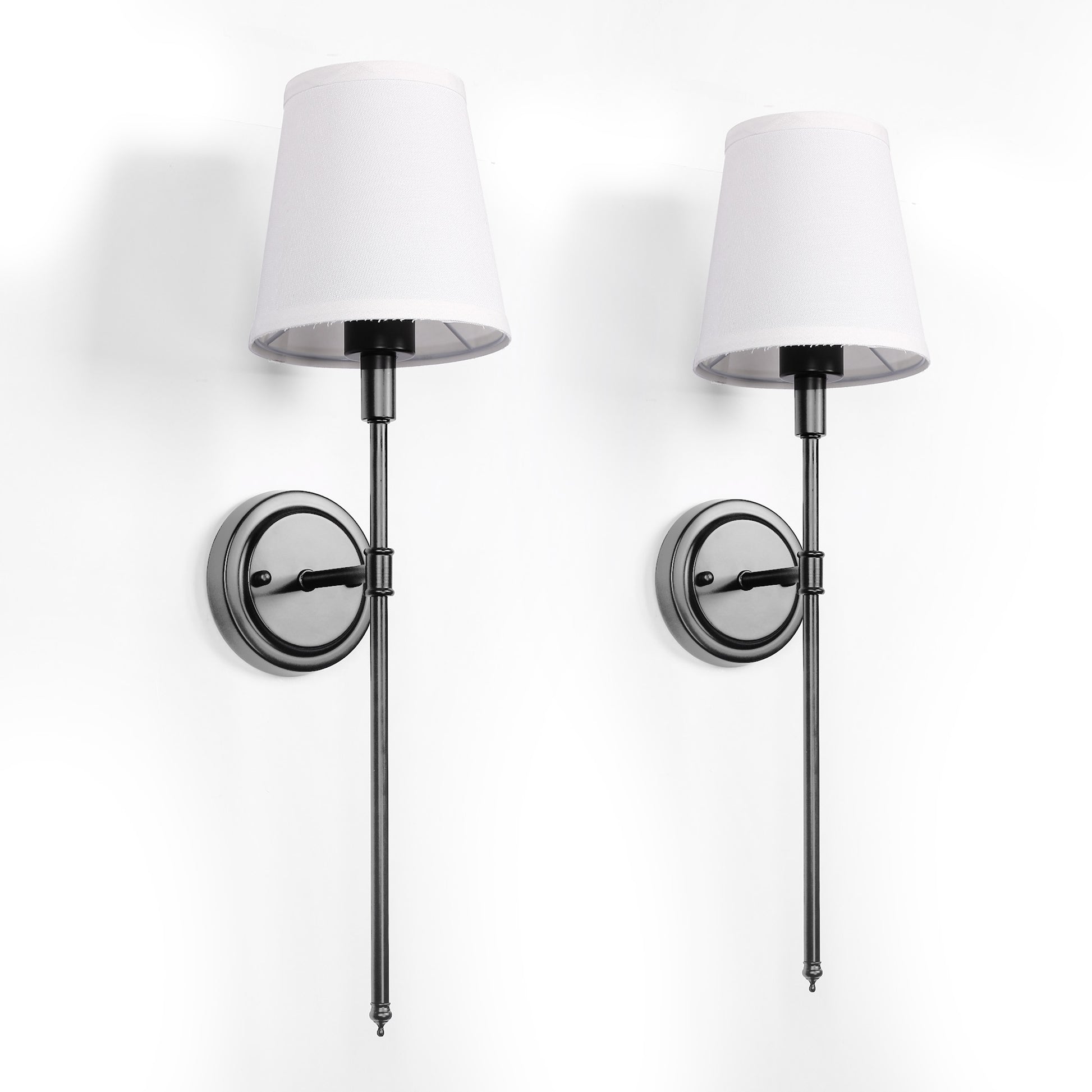 Bring classic elegance to your home with this 2-pack of black indoor wall sconces featuring soft fabric shades and clean silhouettes. Designed for E26 base bulbs (not included), these fixtures offer a gentle, ambient glow that complements modern, transitional, or traditional interiors. Ideal for flanking a bed, lighting up a hallway, or framing a mirror, these sconces blend form and function with timeless style and easy installation.