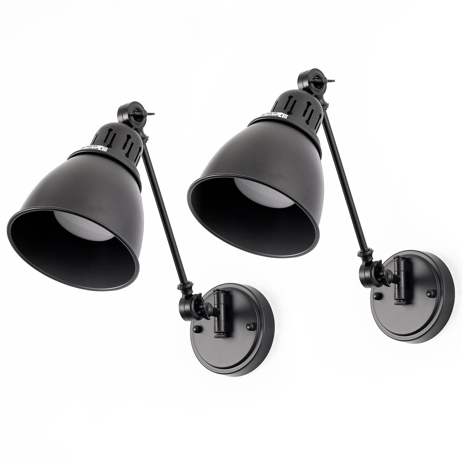 Illuminate your bedroom, office, or reading corner with this set of 2-swing arm wall sconces. These adaptable lights offer a flexible arm for easy adjustment, allowing you to direct the light exactly where it's needed. They can be installed as plug-in fixtures or hardwired for a more permanent solution. The sleek black finish with a white interior enhances brightness, making these sconces both a stylish and practical choice for any room.