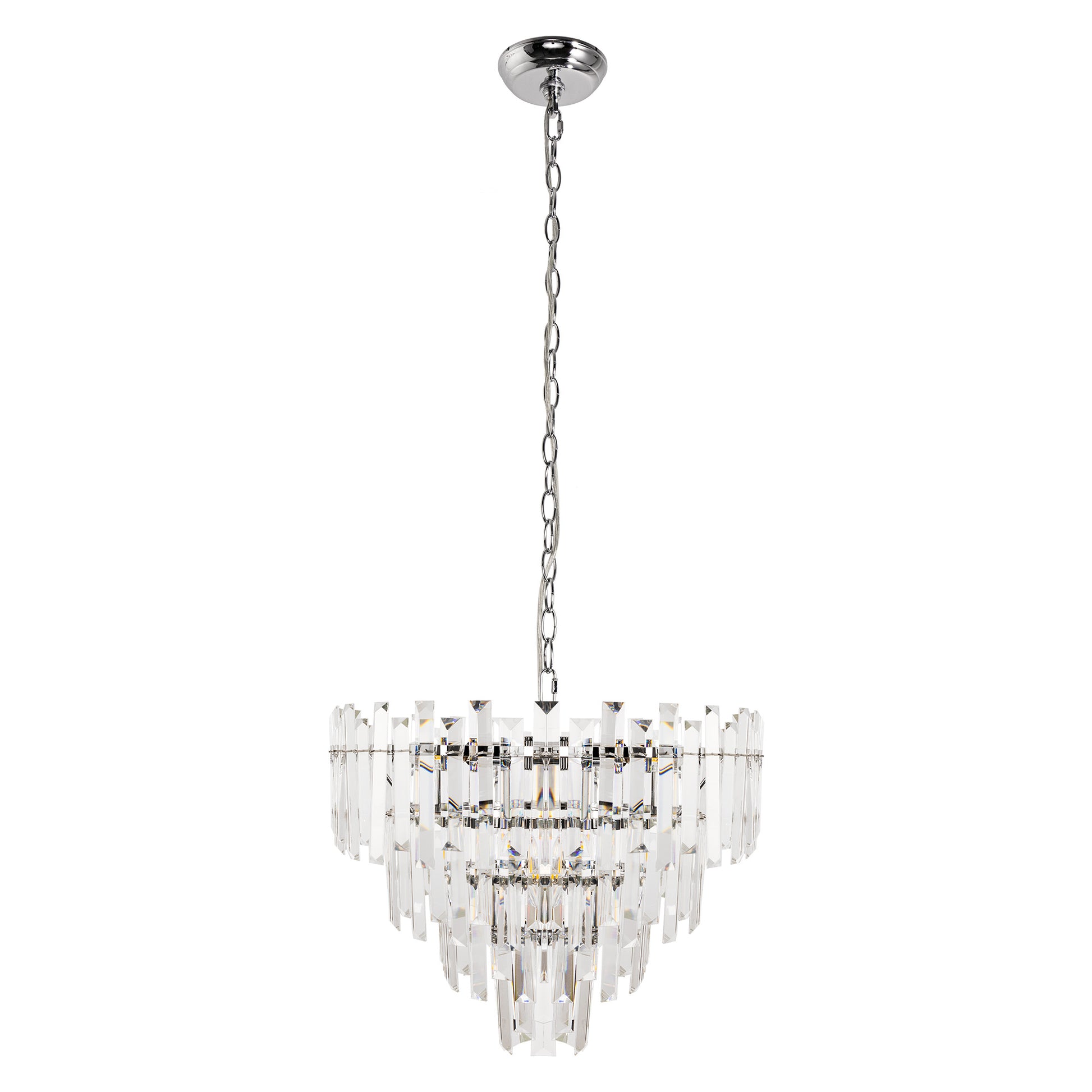 This 3-tier crystal drum chandelier adds a modern yet glamorous aesthetic to your home decor with its shimmering chrome finish and faceted crystal detailing. Designed with 6 E12 sockets, it provides bright and even illumination to your dining room, kitchen, or living area. Its KD (knock-down) structure allows for secure packaging and simplified assembly, blending form with function.