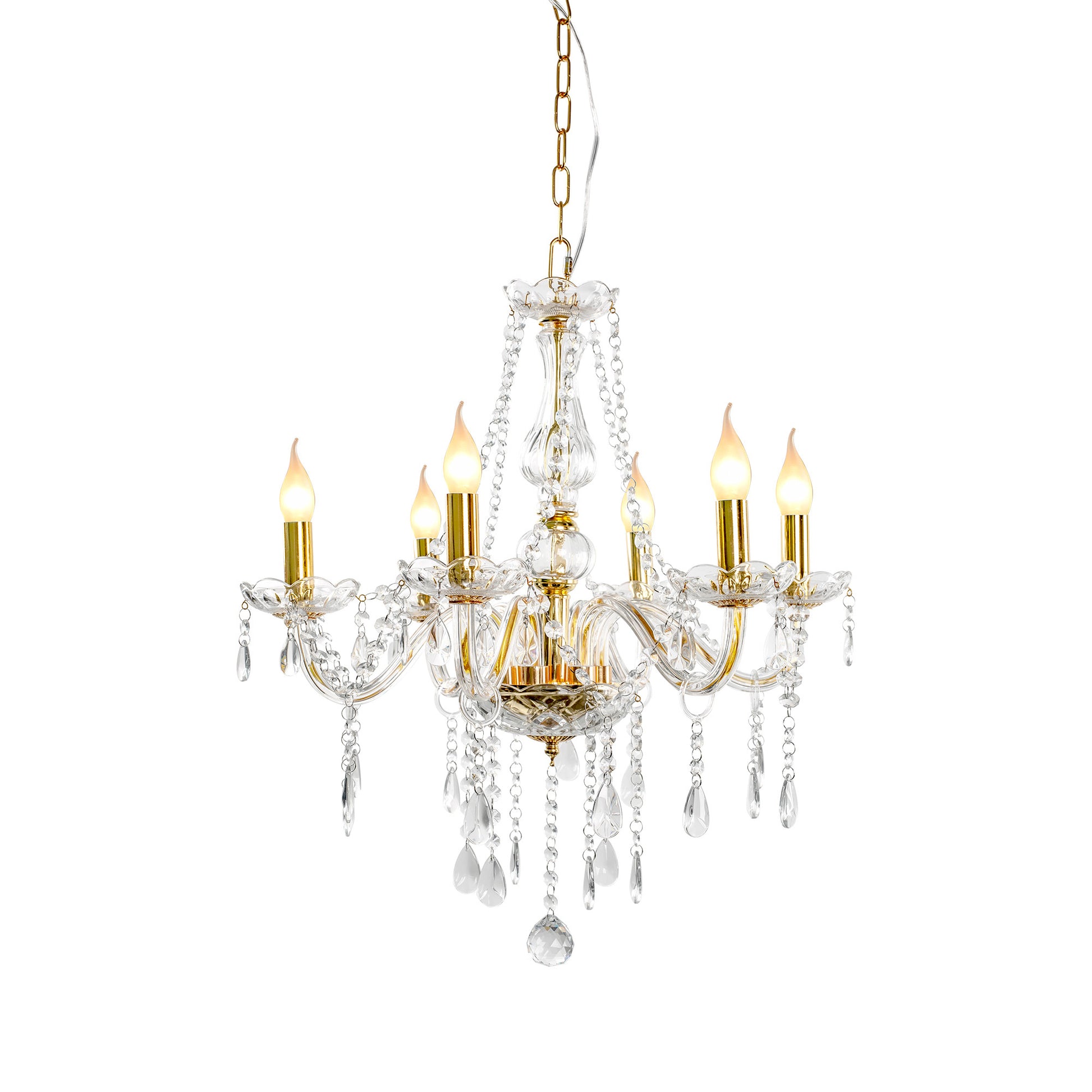 This stunning 6-light chandelier features a gold finish with crystal accents, offering a luxurious and timeless design. Perfect for living rooms, dining rooms, or entryways, it provides ample lighting and a touch of elegance to your space. The E12 bulb base allows for easy customization of lighting, and the chain adds an extra layer of sophistication to this piece. Its beautiful crystal design brings a refined aesthetic to any room.