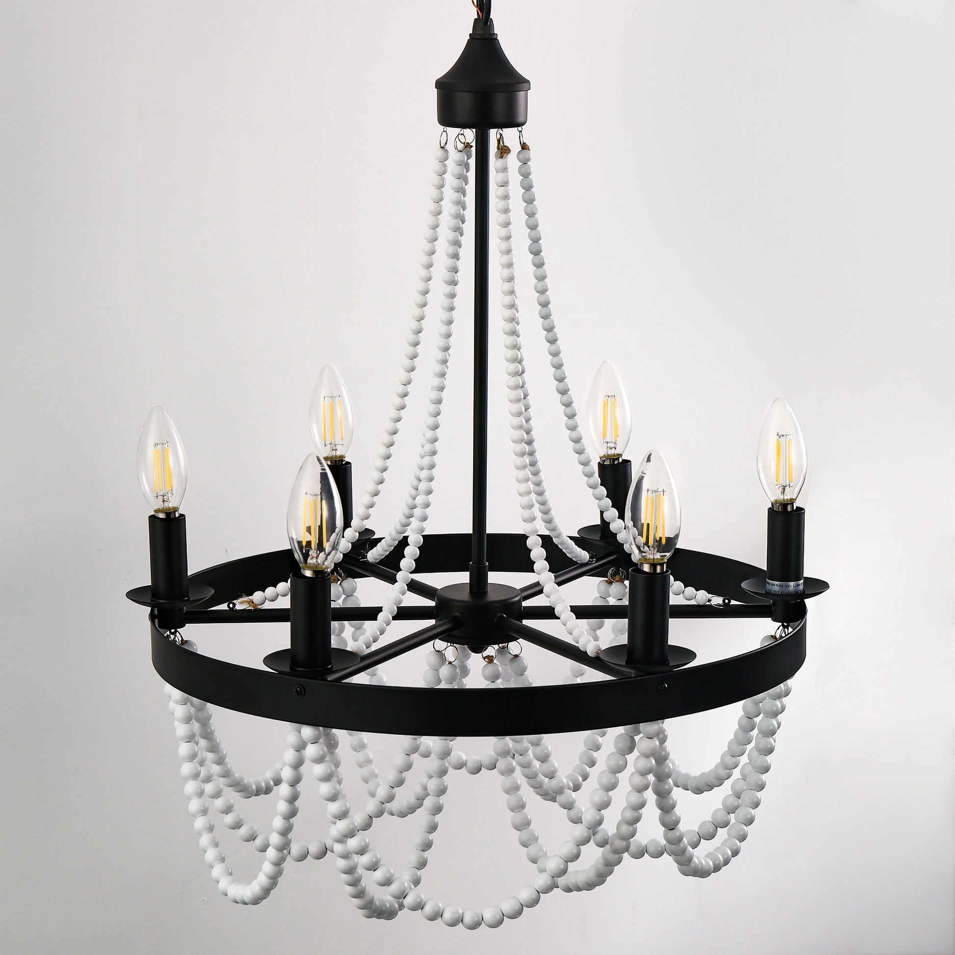YANSUN 6-Light Matte Black Branch Wagon Wheel Chandelier with White Wooden Beads,E12 Base,Boho Modern Pendant Light for Kitchen
