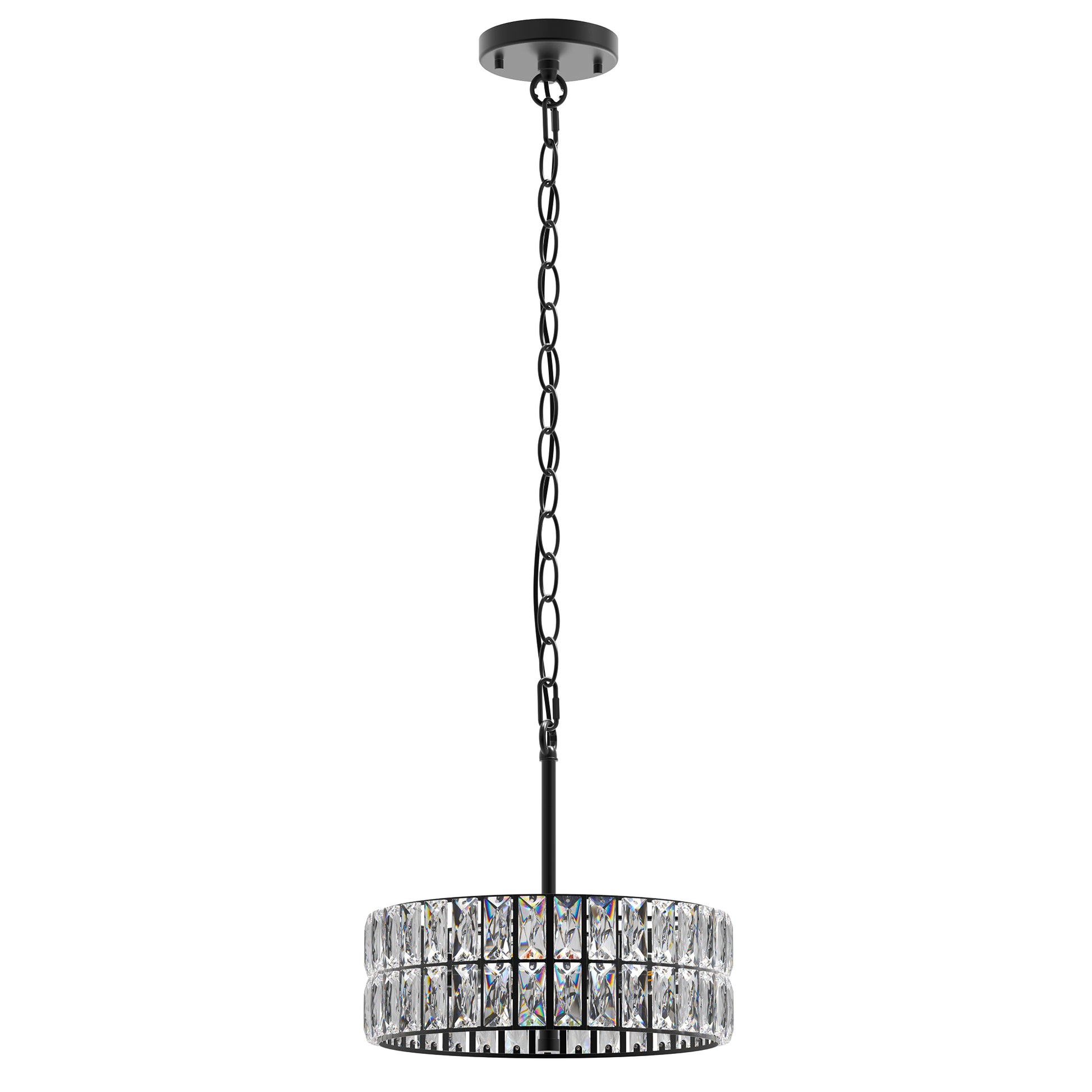 Elevate your space with this elegant 3-light black drum chandelier, designed with crystal accents and frosted glass shades for soft, diffused illumination. Its timeless shape and modern finish suit dining rooms, kitchens, or entryways. The fixture is compatible with E12 base bulbs. (Light Bulbs Not Included).